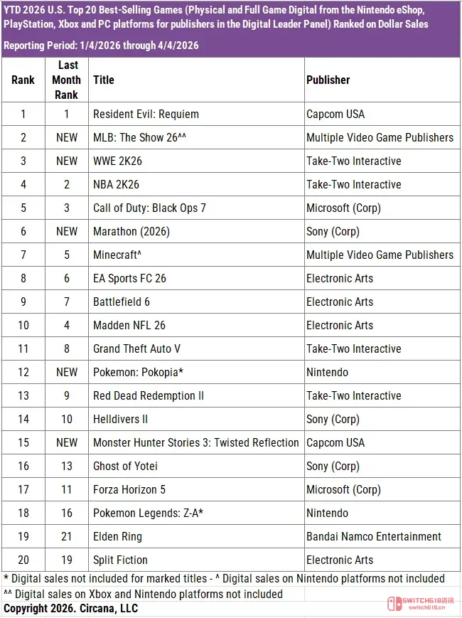 先看3月榜,《MLB The Show 26》这次冲到了第一,《安魂曲》紧随其后排第二、《WWE 2K26》第三。《失落星船:马拉松》排第四,《宝可梦Pokopia》排第五。有一说一,任天堂这波是真的稳。